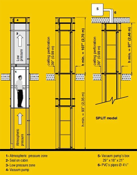Thang máy gia đình chân không có phần cabin hình trụ, đồng tâm di chuyển trong khung chịu lực, dọc theo cột, là kết cấu chịu lực của kệ khung hình trụ. Thành cabin cũng được làm từ tấm polycarbonate uốn cong và trong suốt. Mỗi cabin đều được trang bị hệ thống neo cơ học với vai trò kích hoạt để giữ cabin cố định khi thang tới điểm dừng, đảm bảo cabin dừng chính xác và êm ái tại nơi gọi thang.